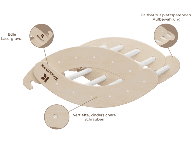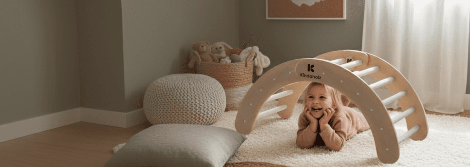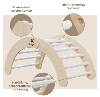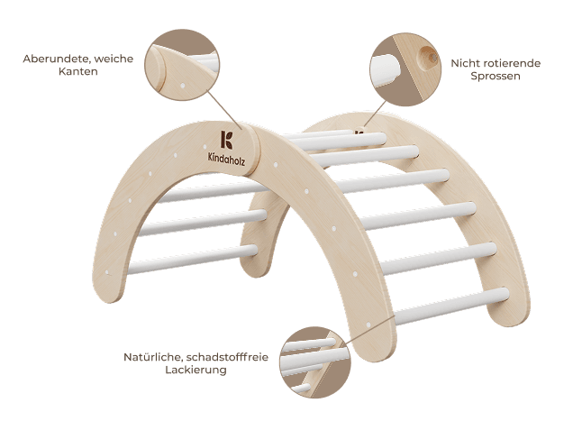 Der Kletterbogen NINA aktiviert den ganzen Körper: Beim Greifen, Klettern und Balancieren trainiert dein Kind spielerisch Kraft, Gleichgewicht und Hand-Augen-Koordination. So stärkt es Grob- und Feinmotorik und legt die Basis für viele spätere Bewegungsabläufe.